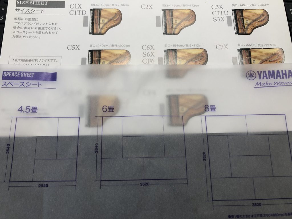 こんな↓用紙をいただきました。ヤマハのピアノの機種の配置をシミュレーションできるものです。サイトもあります。(部屋置きシミュレーション